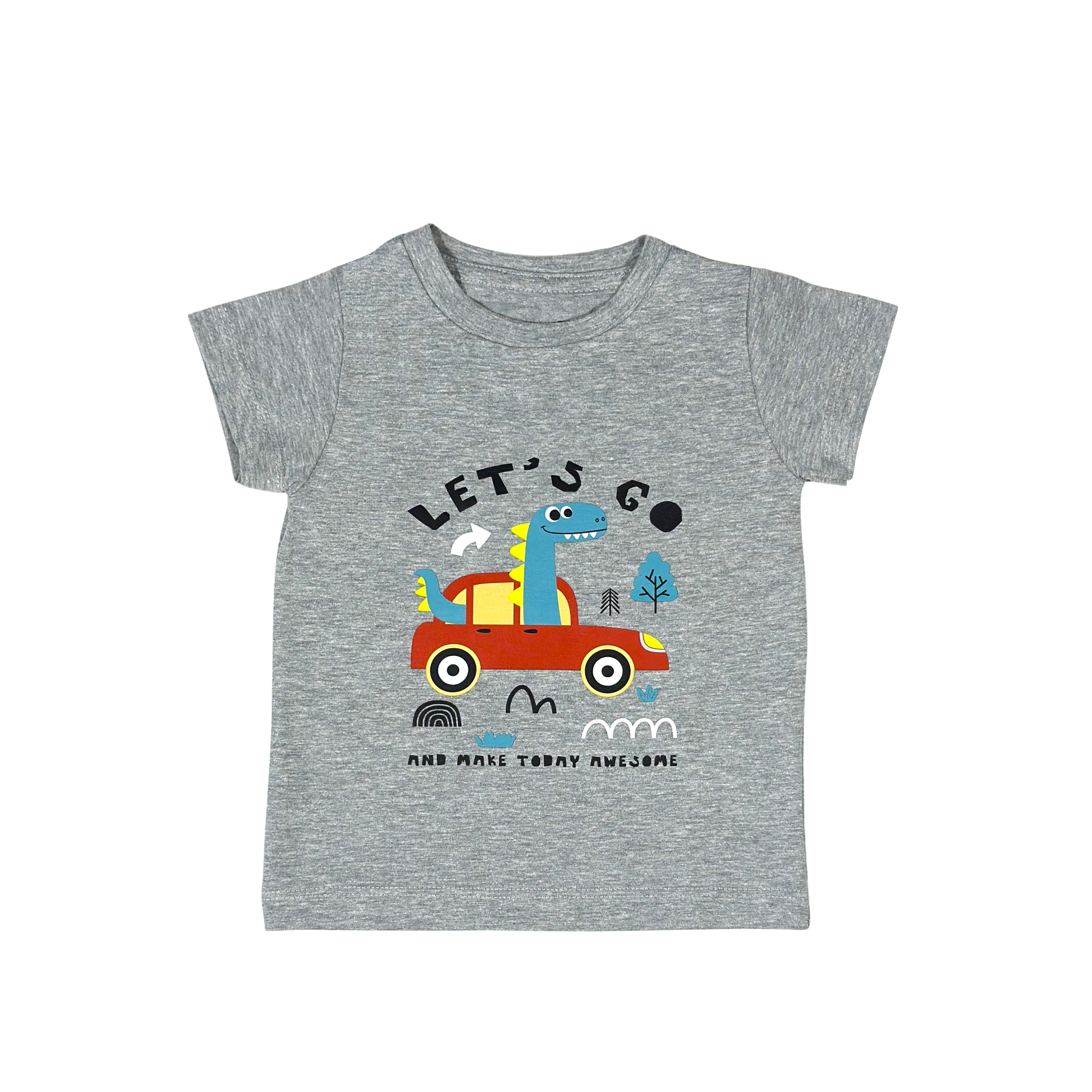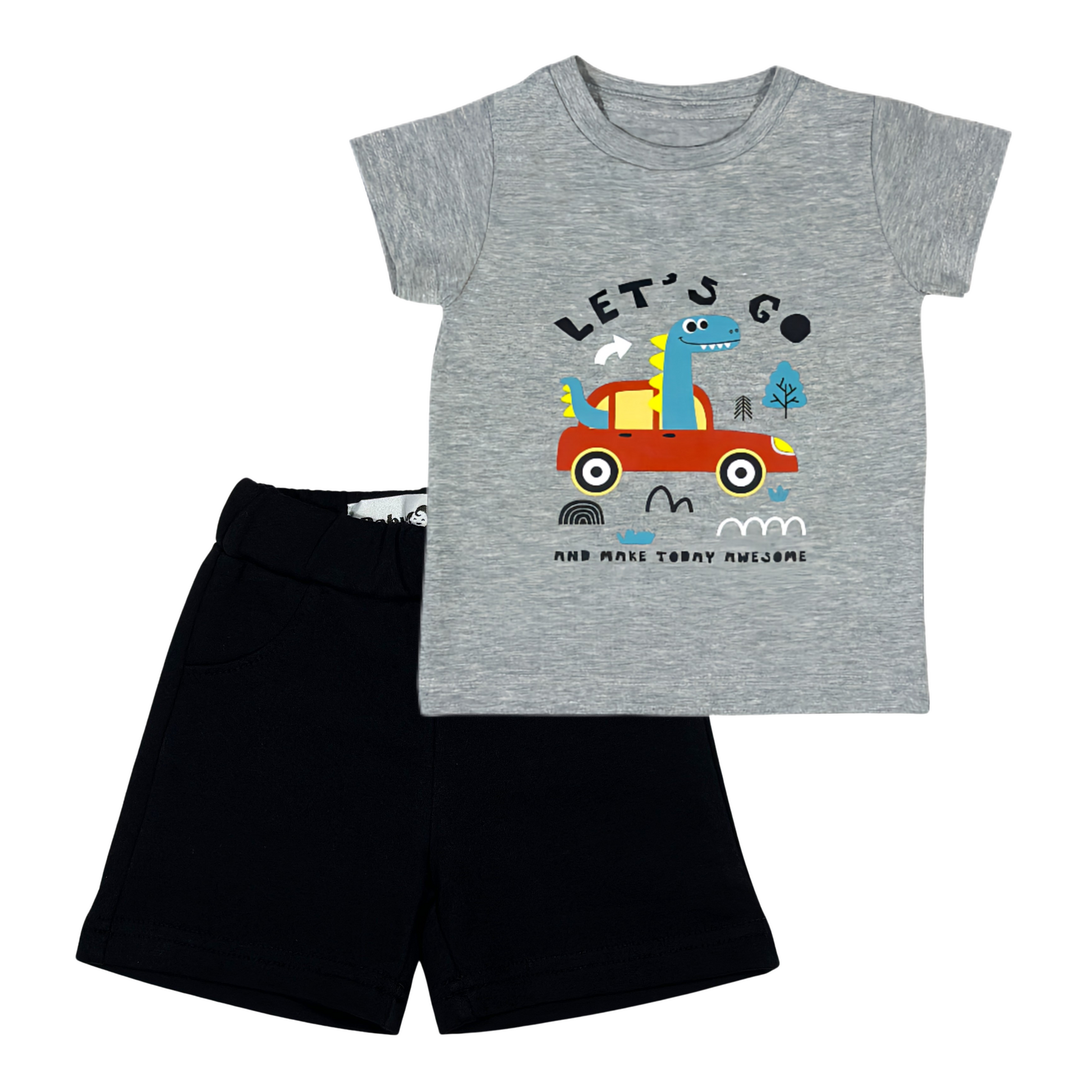 مجموعة ديناصور رمادي في سيارة (تي شيرت رمادي + شورت أسود)