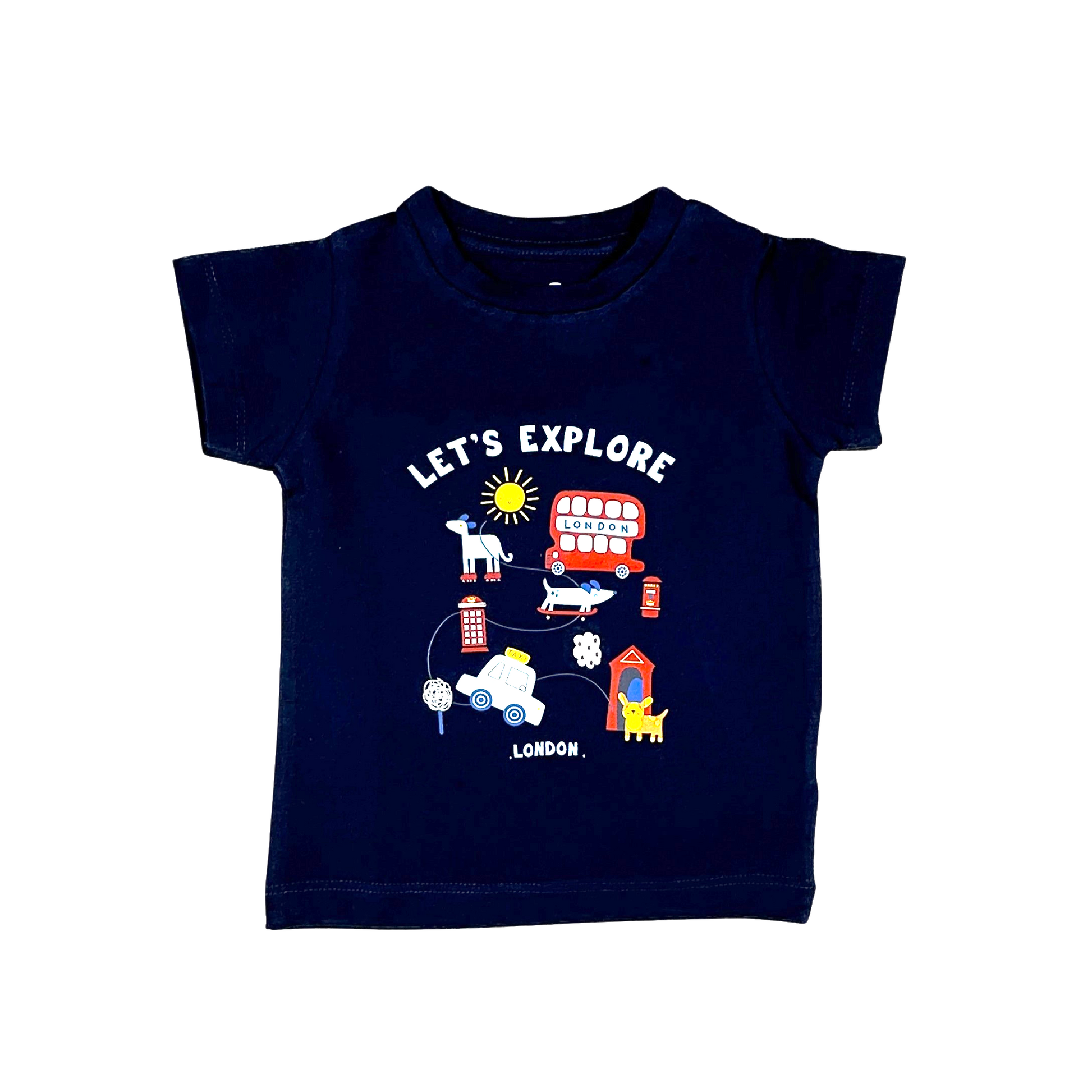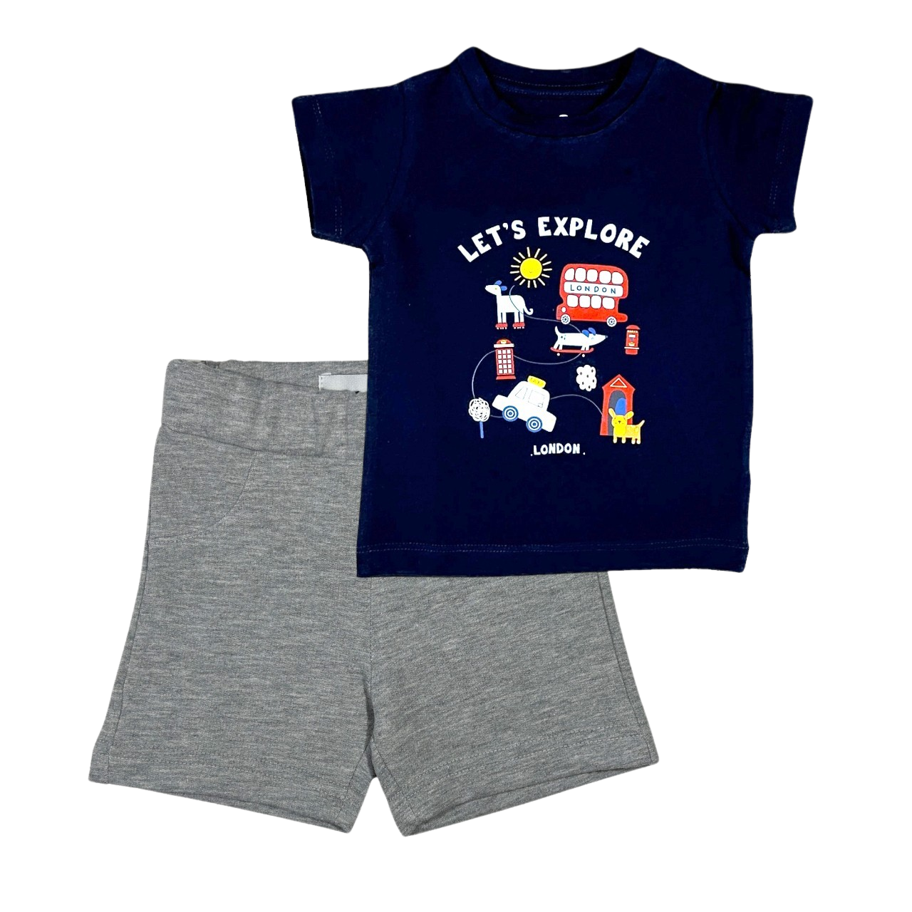 طقم قطني "لنستكشف" باللون الأزرق البحري (تي شيرت أزرق بحري + شورت رمادي فاتح)