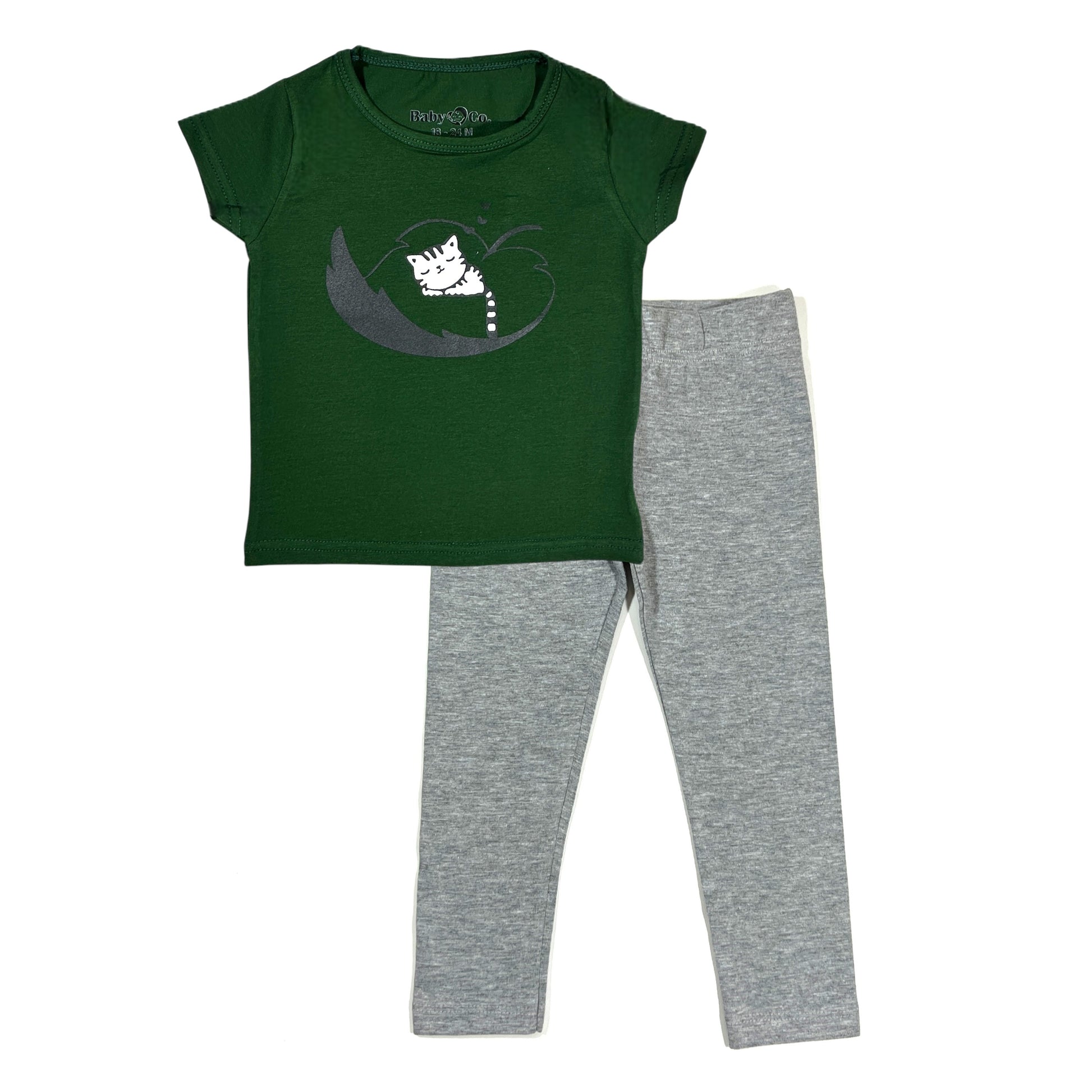 Sleeping Cat Girl Set (Green T-shirt & Grey Leggings)